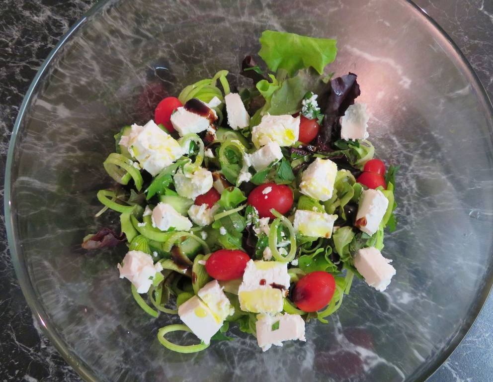 - Für die Salatschale mit Schafkäse Gemüse waschen und trocknen. Den Lauch in Ringe schneiden, die Gurke halbieren und in Scheiben schneiden. Den Schafkäse in Stücke schneiden. Petersilie zupfen und grob hacken.