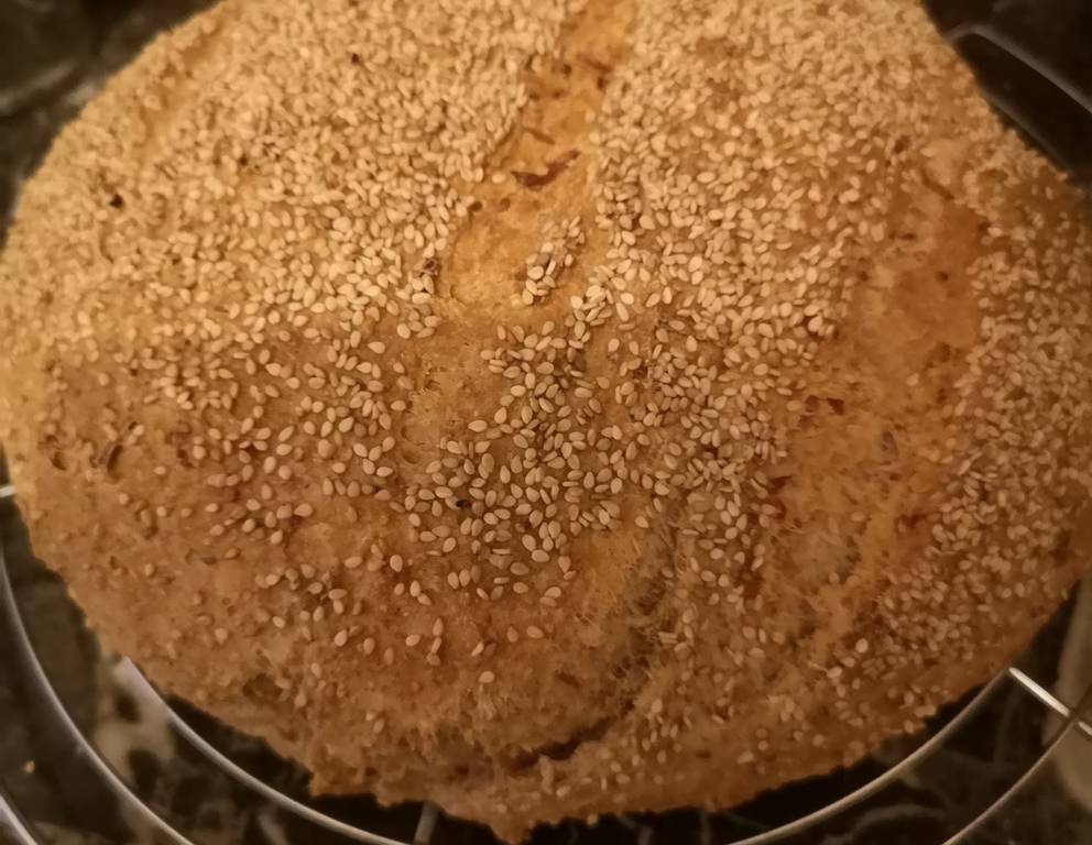 - Den Teig auf die leicht bemehlte Fläche Form und grob rund formen, ein paar Min. abgedeckt entspannen. Anschließend den Teig zu einer Kugel formen und auf ein Stück Pergamtenpapier legen. Die Teigoberfläche mit verquirltem Ei bestreichen und mit Sesamkörnern überstreuen. Abgedeckt weitere 20-30 Min. gehen.