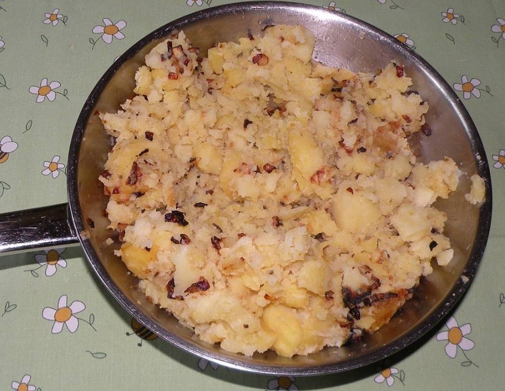 - Wenn die Zwiebeln hellbraun sind, die Erdäpfel in die Pfanne geben, einige Minuten mitbraten, die Herdplatte noch kleiner schalten und die Erdäpfel mit einem Stampfer zerstampfen. Dann salzen, mischen und servieren.