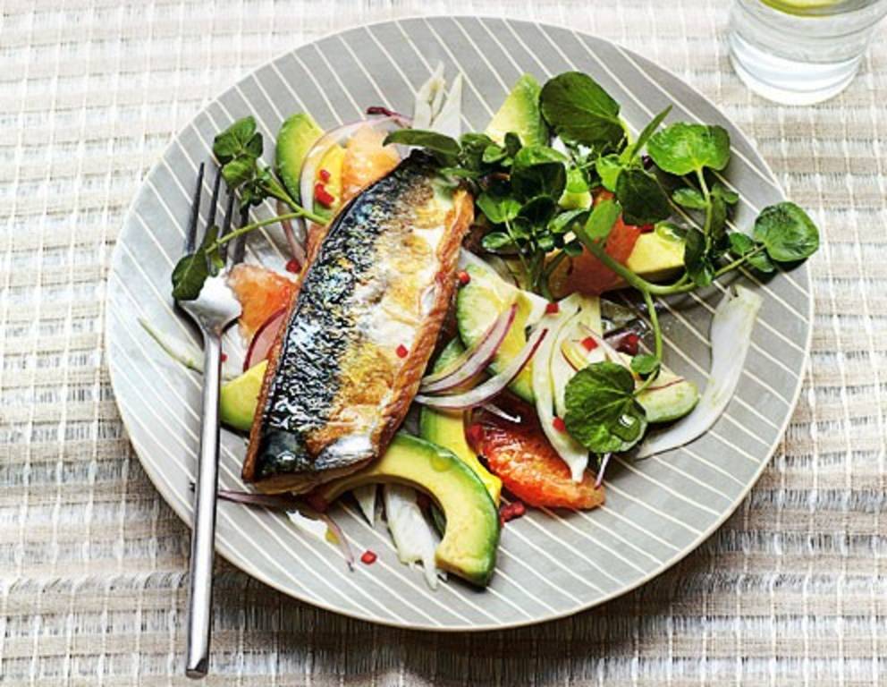 - Das Dressing über den Salat gießen und vorsichtig untermischen. Den Salat auf 4 Teller verteilen und mit je einem Makrelenfilet belegen. Gebratene Makrele mit Avocado und Grapefruit servieren.