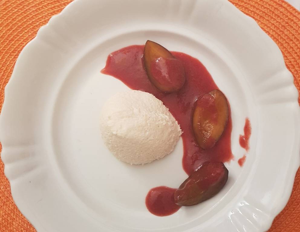 - Eine Nocke Creme, etwas Powidl, ein paar Viertel der Gewürzzwetschken auf Tellern anrichten und servieren.