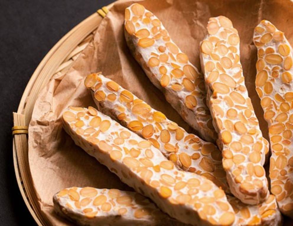 - Die Zubereitung im Beutel bei 30 bis 34 °C für 36 bis 48 Stunden fermentieren lassen. Ab einer Gärzeit von 24 Stunden überprüfen, ob das Myzel (die weißen Fäden) den Raum zwischen den Körnern auffüllt. Wenn die Sojamasse von Weiß überzogen und fest ist und nach frischen Champignons duftet, dann ist das Tempeh fertig. Gut verpackt, hält es im Kühlschrank 1 Woche und in der Tiefkühltruhe mehrere Monate.