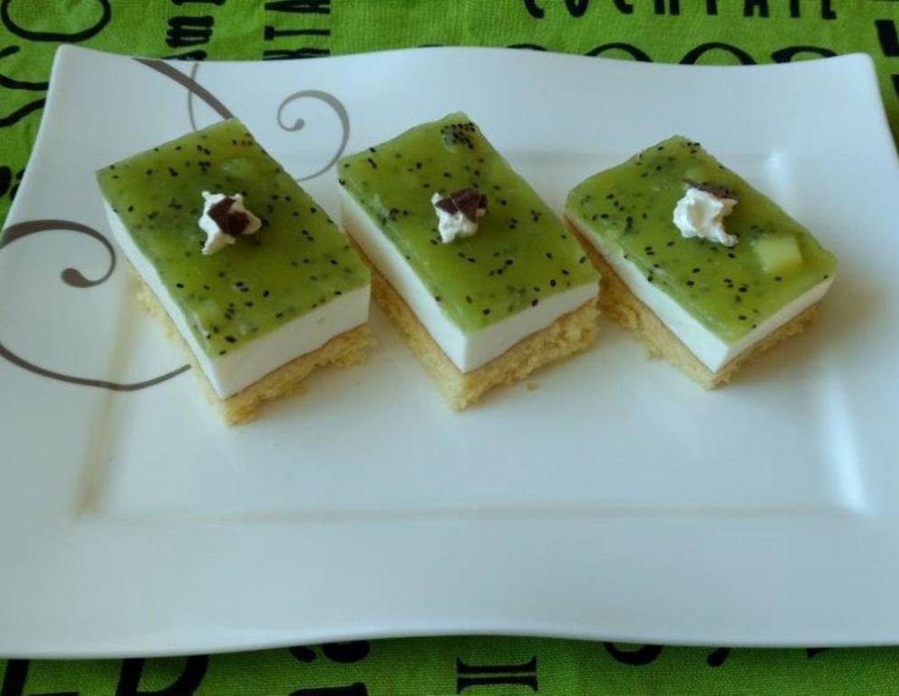 Durch das kurze Kochen der Kiwi ist sie auch in Kombination mit Milchprodukten nicht bitter und die Gelatine geliert. Auch wenn es etwas länger gedauert hat. Die Kiwi-Joghurtschnitten noch beliebig garnieren.