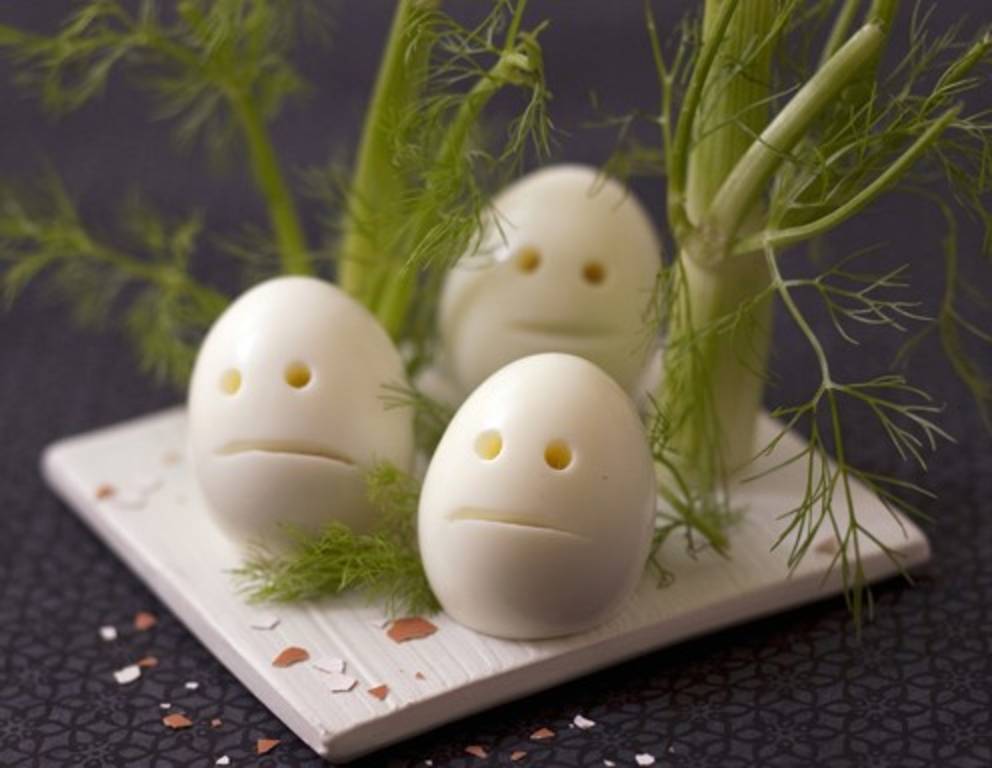 Die Eier-Gespenster können natürlich auch noch kreativer auf "Brotbrösel-Erde" oder mit "Blut-Dip" angerichtet werden. Sie können die Gespenster auch als gefüllte Eier servieren.