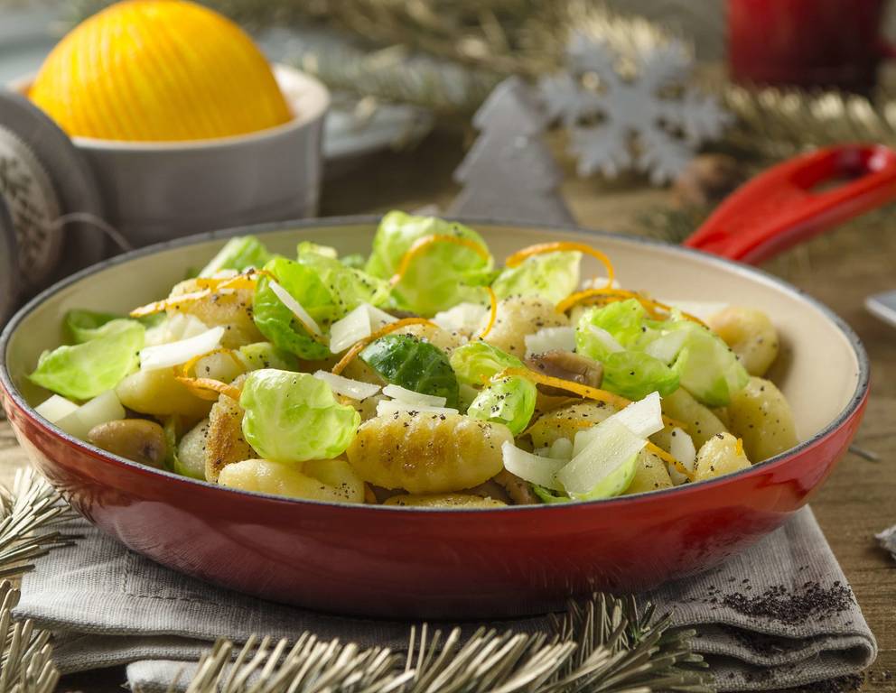- Sardellenfilets in einer weiteren Pfanne zergehen lassen. Kohlsprossenblätter, Maroni und Gnocchi mit Olivenöl hinzufügen, Orangenzesten untermischen und durchschwenken. Mit Salz und Pfeffer abschmecken.