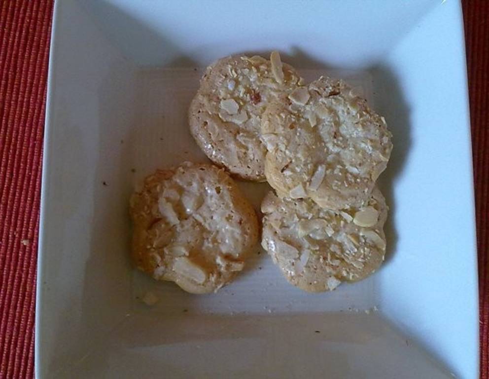 - Die Blüten auf ein mit Backpapier ausgelegtes Backblech geben und mit der Glasur bestreichen. Mandelblättchen daraufstreuen und die Kekse im vorgeheitzen Backofen bei 230 °C etwas 5-7 Minuten backen.