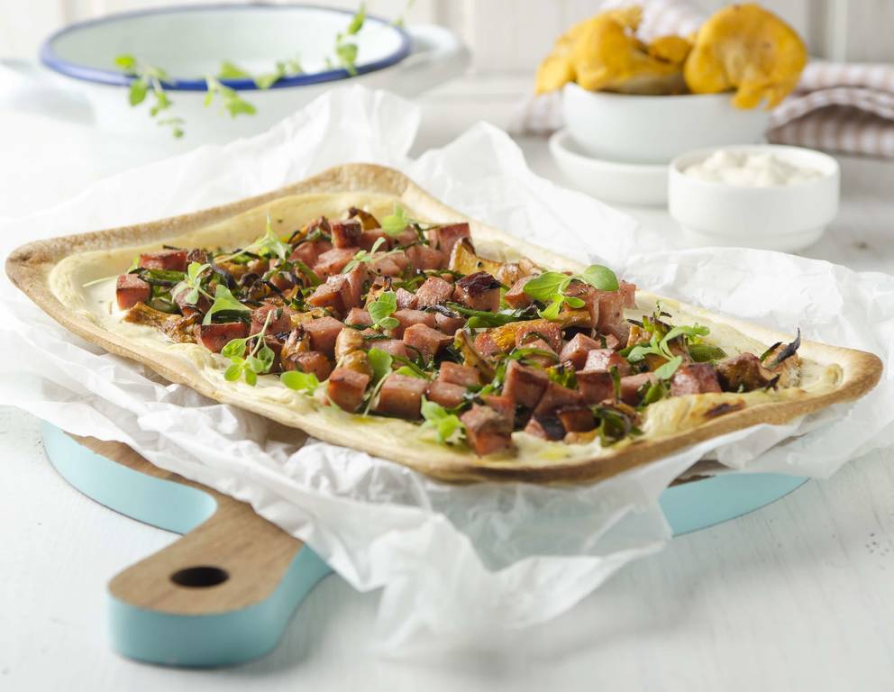 Den Flammkuchen mit Leberkäse, Lauch und Eierschwammerl am besten warm genießen. Wer möchte verwendet Dijonsenf.