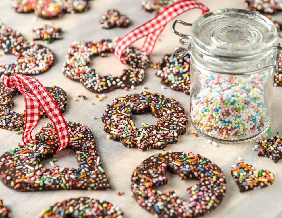 Sie können die Arabesken mit jeder beliebigen Schokolade und allen Farben zubereiten: Mit weißer oder Vollmilchschokolade, mit Lebensmittelfarbe, einfärbigen Streuseln... Ihrer weihnachtlichen Phantasie sind keine Grenzen gesetzt.