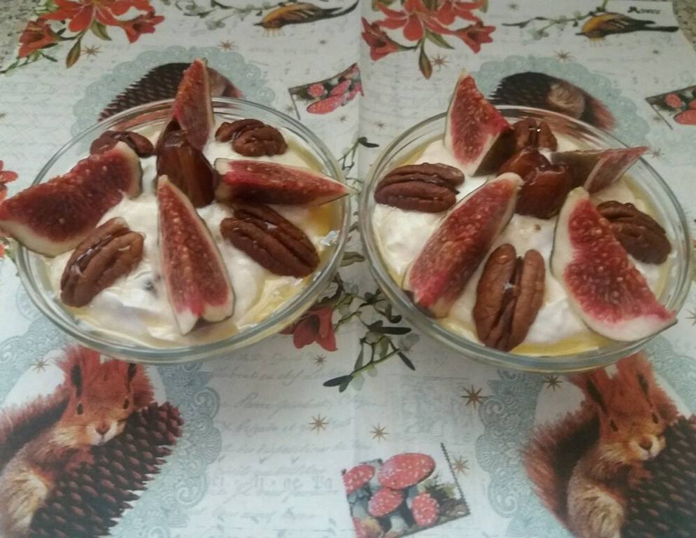 - Feige gut waschen, vom Stielansatz befreien und achteln, je 4 Stück auf die Zimt-Topfencreme setzen, dazwischen die Pakannußhälften legen, in die Mitte eine halbierte Dattel stecken und mit je 1 TL Honig beträufeln.