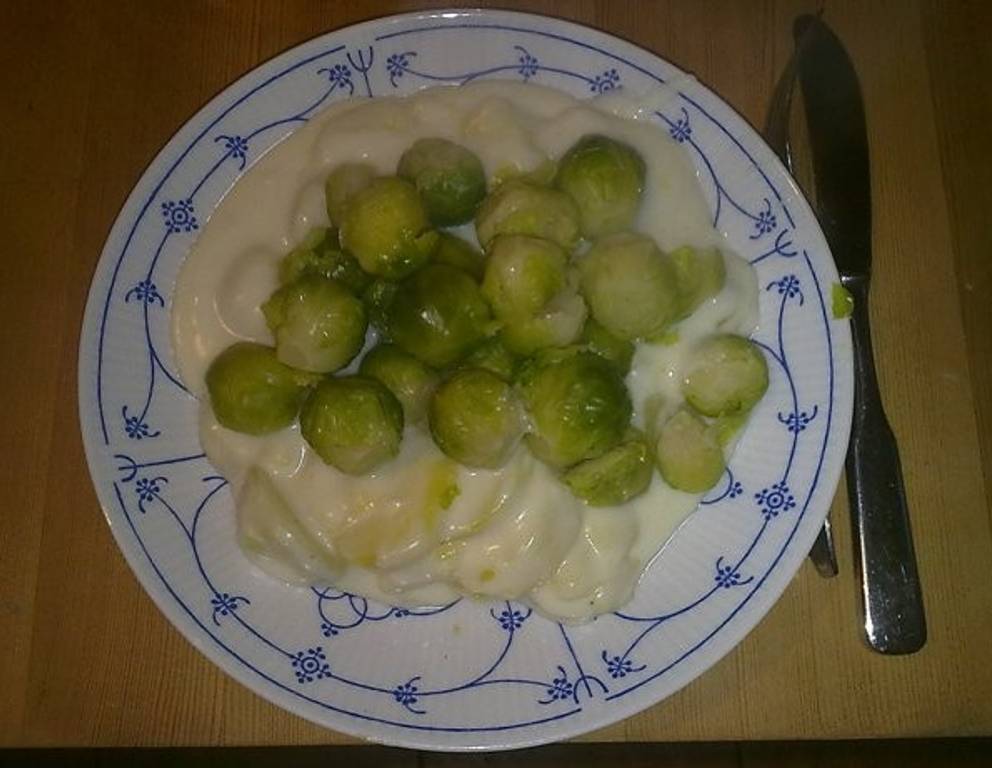 Die Kohlsprossen auf Béchamelkartoffeln beliebig mit frisch gehackten Kräutern verfeinern. Wer möchte, gibt ein paar geröstete Speckwürfel darüber oder gehobelte Mandelblättchen.