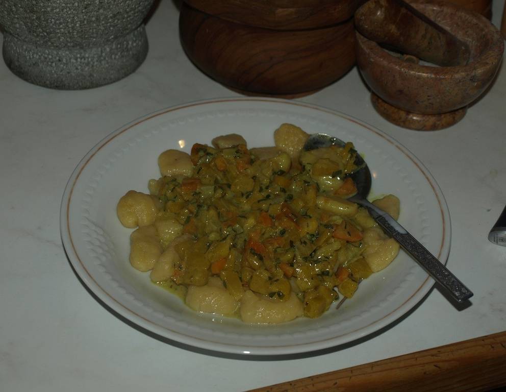 - Die Kürbissauce mit Kokosmilch mit Kürbisgnocchi servieren.