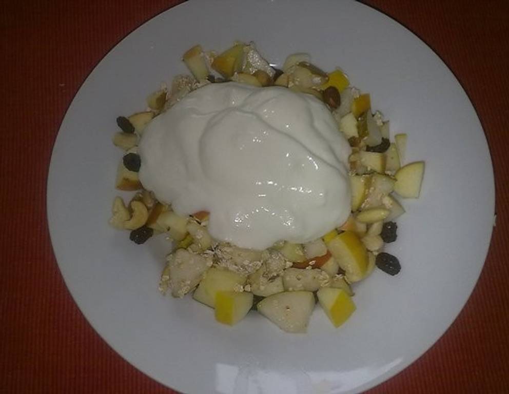 - Für das Herbstmüsli Apfel und Birne waschen, vom Kerngehäuse befreien und in kleine Stücke schneiden. Den Joghurt mit dem flüssigen honig vermischen und glattrühren.