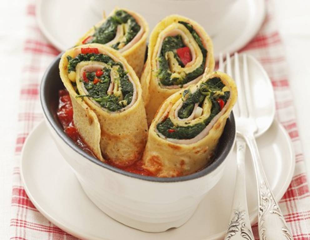 - Die Palatschinken auf einer Arbeitsfläche ausbreiten und mit je einer Scheibe Schinken belegen. Den Spinat darauf dünn verteilen und die Palatschinken zusammenrollen. Die Tomatensauce abschmecken und auf Schälchen verteilen. Die Palatschinken halbieren und aufrecht in die Tomatensauce stellen.