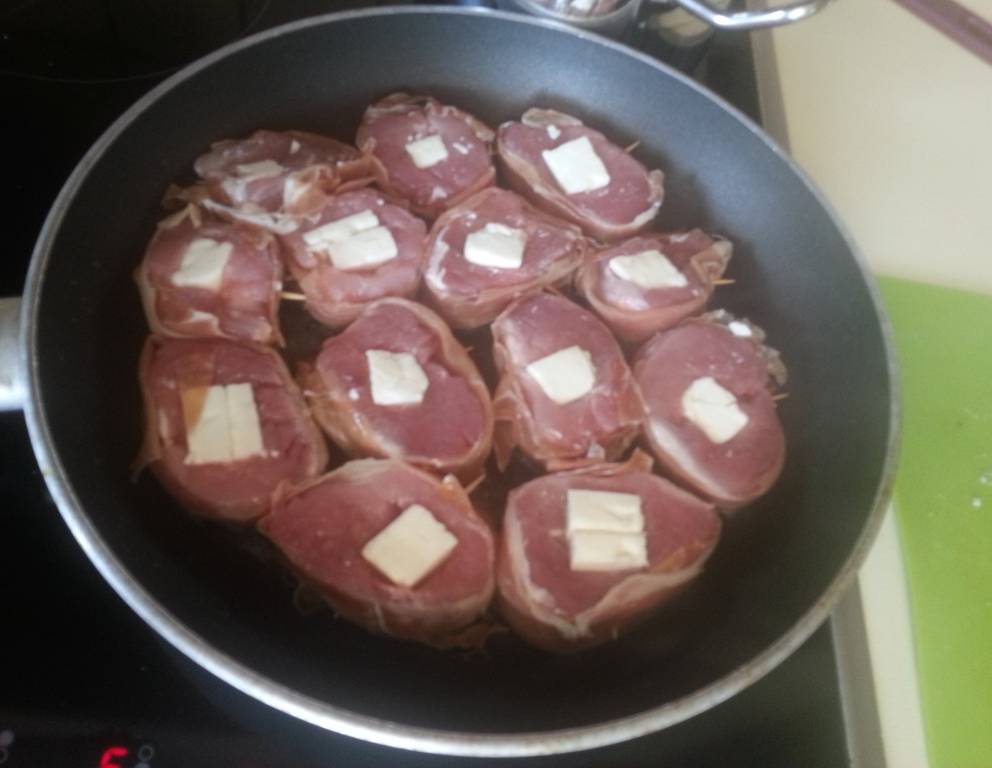 - 12 kleine Würfel vom Schafkäse abschneiden, die in die Löcher der Medaillons passen. Käse in die Löcher stecken. Die gefüllten Medaillons mit einer Scheibe Prosciutto umwickeln und mit einem Zahnstocher fixieren.