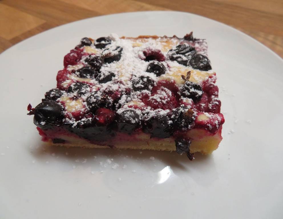 Zur Stachelbeer-Himbeer-Schnitte passt hervorragend Vanille-Schlagobers oder eine Kugel Vanilleeis.