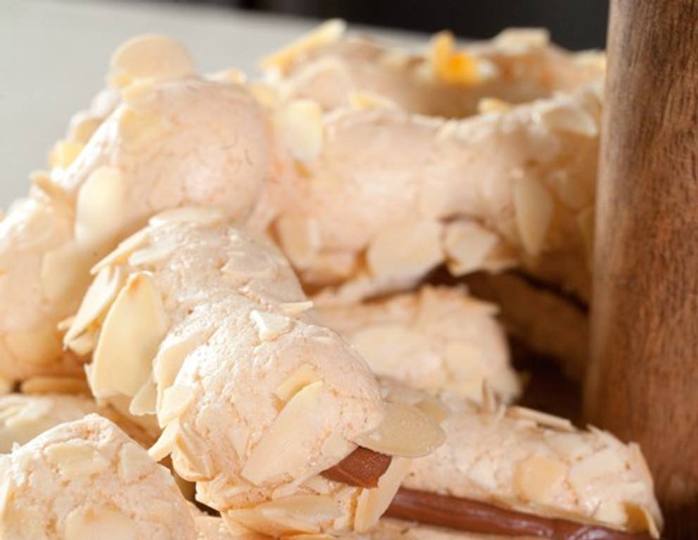 - Für die Nougatfülle Butter weich werden lassen. Dann gut mit Nougat verrühren, in einen Dressiersack geben und auf die eine Hälfte der Stangerl dressieren. Abschließend mit der anderen Hälfte der Mandelstangerl zusammenkleben.