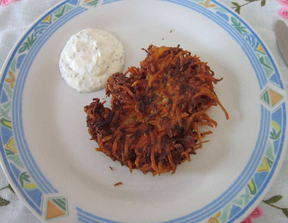 Die Gemüsepuffer können auch mit Weißmehl zubereitet werden. Das Rezept für die Schnittlauchsauce finden Sie HIER!