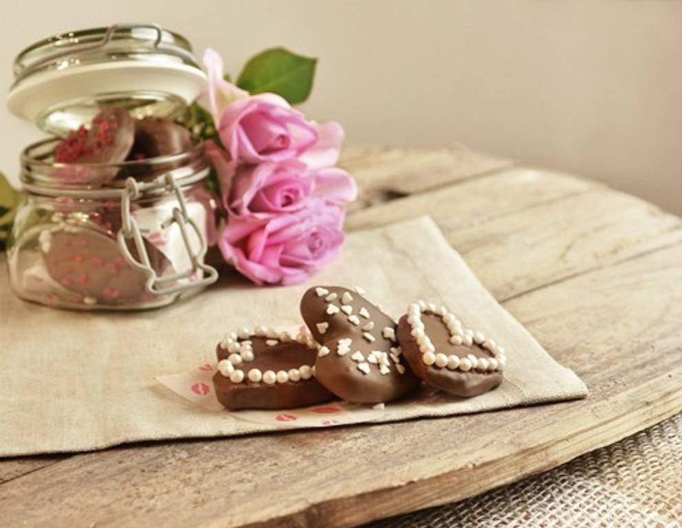 - Die Herzen in die Schokolade tunken und und auf einem Backgitter abtropfen lassen. Mit Zuckerdekor verzieren und so lange kühl stellen, bis die Schokolade vollständig getrocknet ist. Die Schokoherzen in ein Glas füllen.