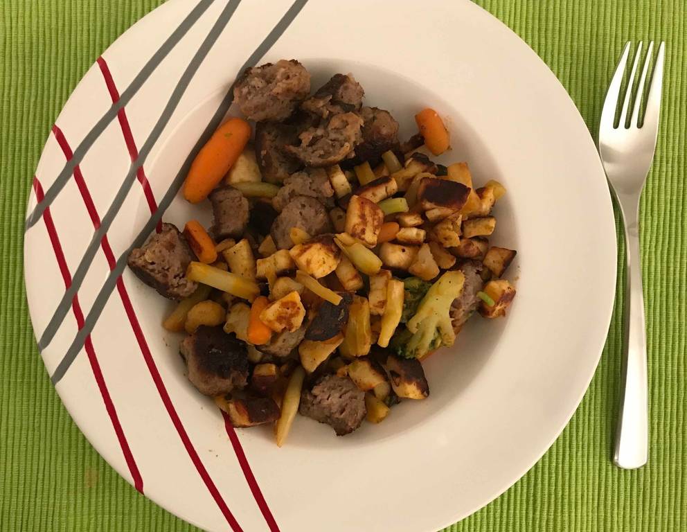Die Fleischlaiberl-Restlpfanne kann mit jedem beliebigen übriggebliebenem Gemüse zubereitet werden. Mit frischen Kräutern verfeinern.