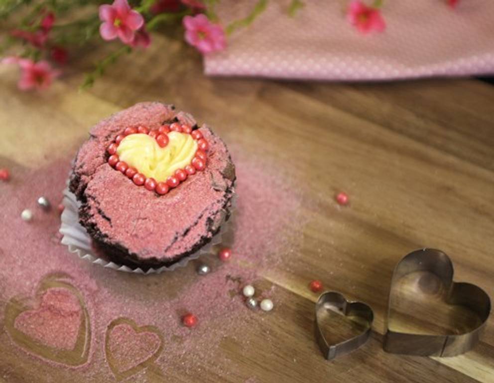 - Aus den Muffins nun mit einem sehr hohen, herzförmigen Ausstecher mittig ein Herz ausstechen - stechen Sie dabei ruhig bis auf den Boden durch - und die Teigreste anderweitig verwenden. (Alternativ mit einem scharfen Messer das herzförmige Loch ausschneiden.)