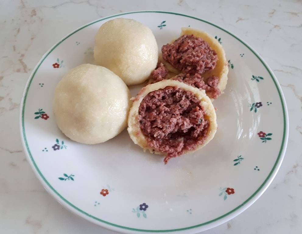 - Aus der Masse 10 Kugerl formen und mit Kartoffelteig ummanteln.