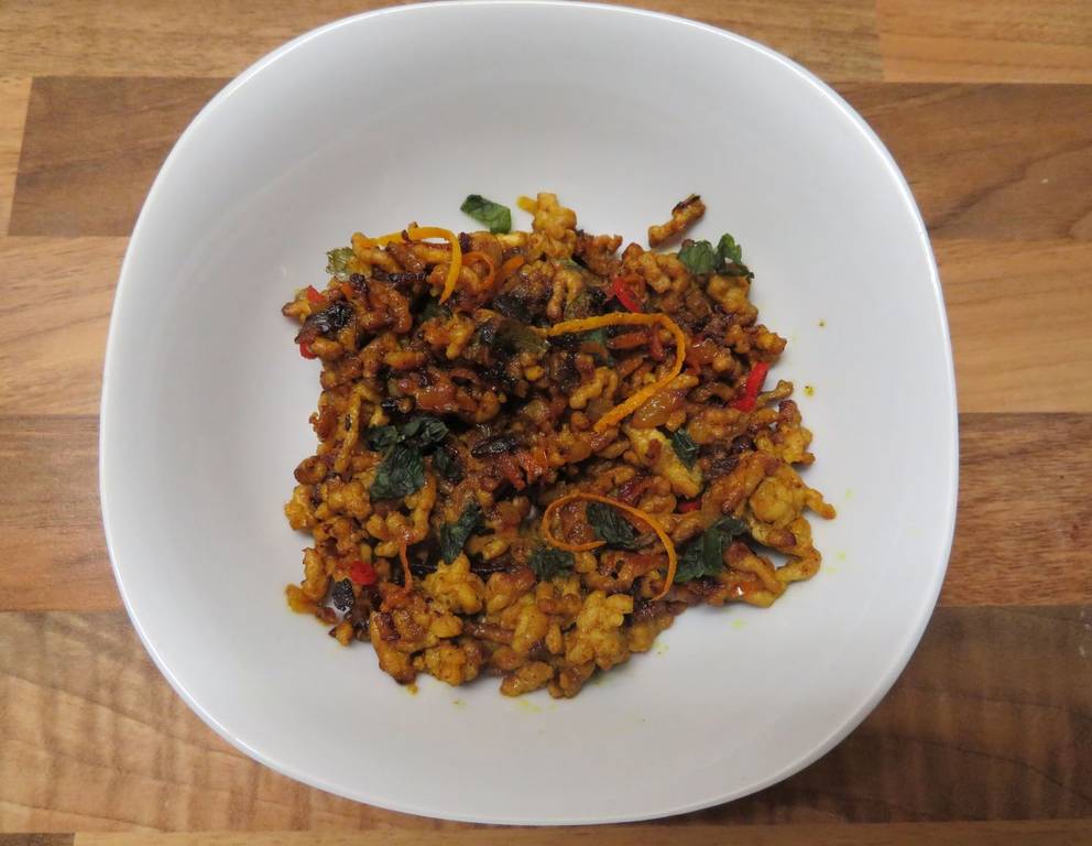 - Das scharfe Orangen-Faschierte anrichten und servieren.