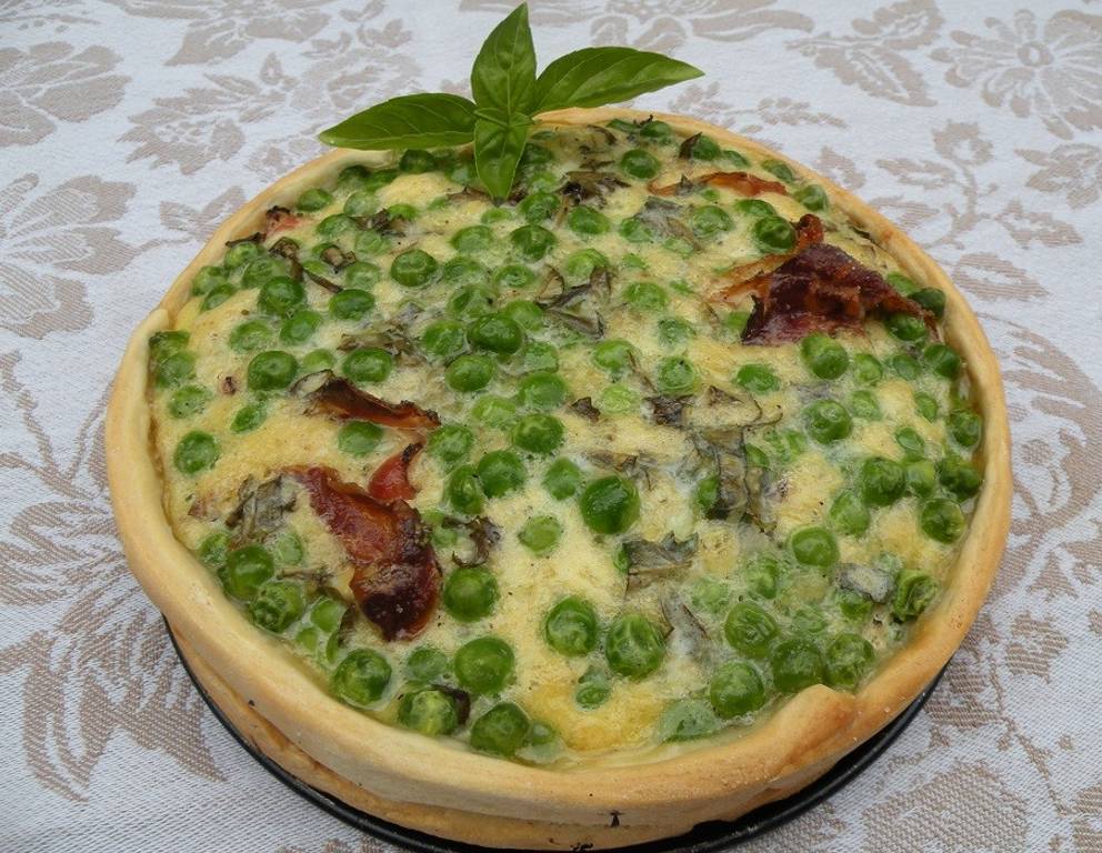 - Für die Frühlingsquiche Erbsen in Salzwasser kurz aufkochen, etwa 3 Minuten kochen, dann abgießen. Fertigen Quicheteig in eine ausgebutterte Tortenform von 20 - 22 cm Durchmesser geben.