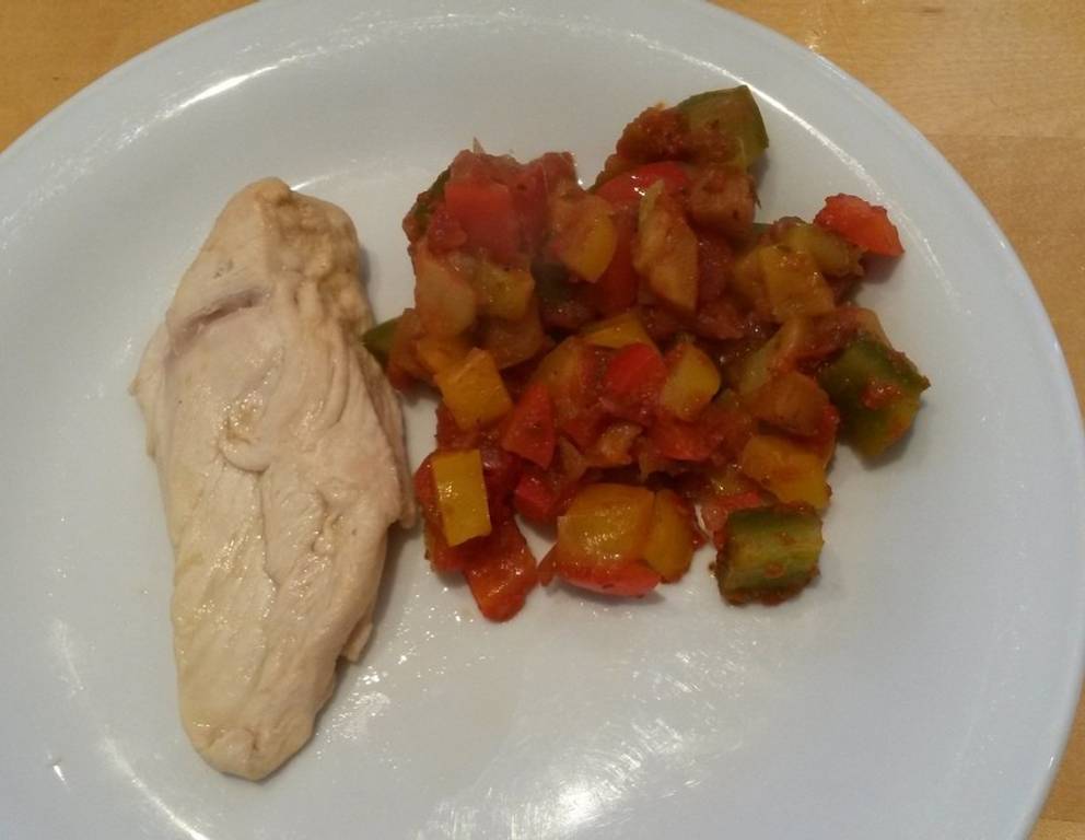 Zum Ratatouille mit Hühnerbrust nach Belieben noch Beilagen reichen oder als leichtes Abendessen kohlenhydratarmes Gericht genießen.