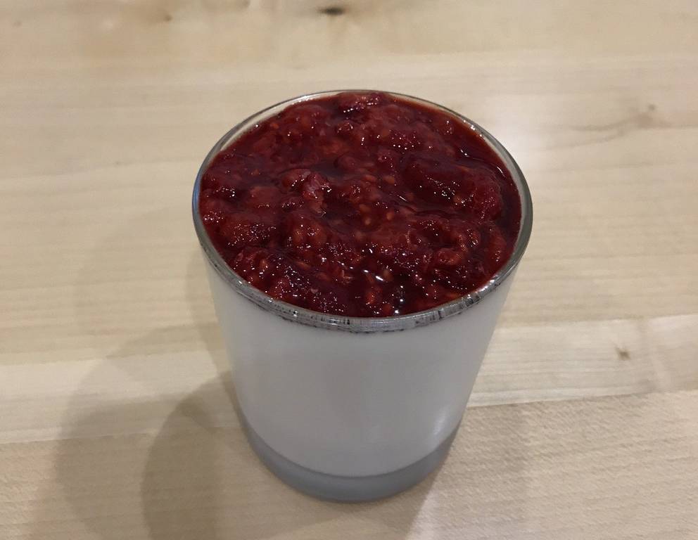 - Für den Himbeerspiegel die Himbeeren mit Staubzucker kurz aufkochen lassen. Die Himbeeren auf der Panna Cotta verteilen und die Panna Cotta mit Himbeerspiegel servieren.