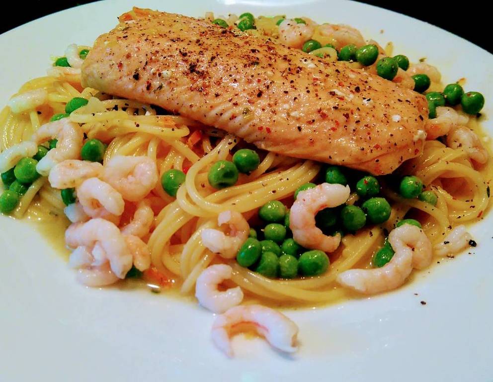 - Die gekochten Spaghetti auf Teller anrichten mit der Sauce übergießen, den Fisch darauf drapieren und das Wildlachsfilet auf Riesling Spaghetti servieren.