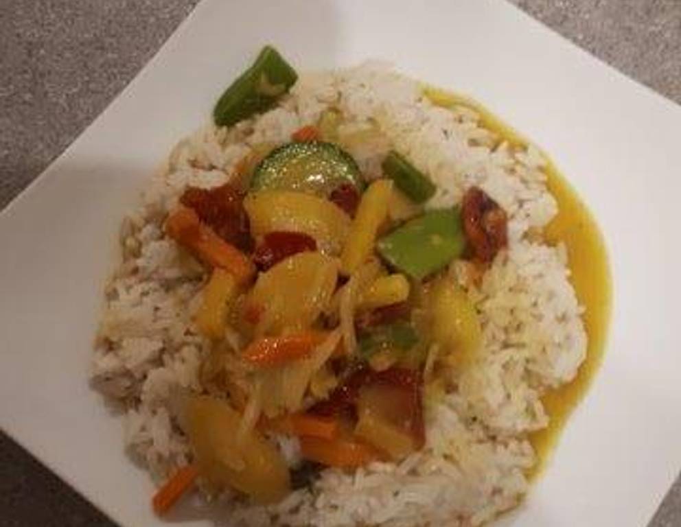 - Nun das Currypulver dazurühren und mit der Kokosmilch aufgießen. Nun das Gemüse dazugeben und ca. 15 Minuten bei mittlerer Hitze köcheln lassen. Das Gemüsecurry mit Reis servieren.