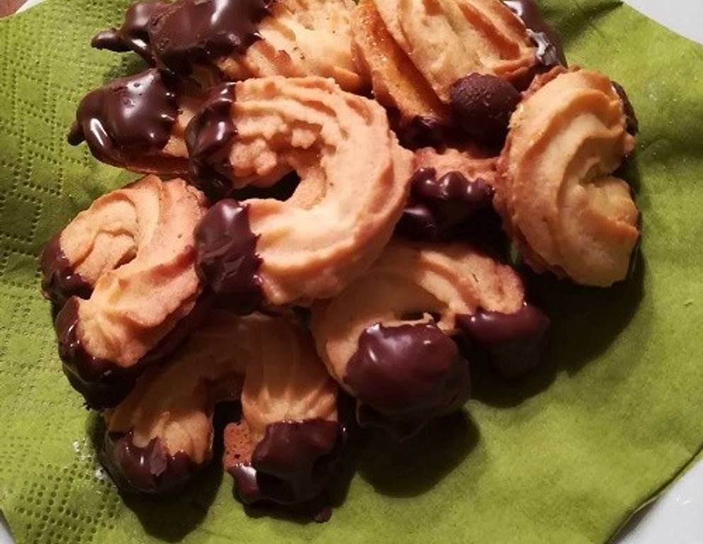 - Das Marzipan-Spritzgebäck ausgekühlt in Schokoglasur tauchen.
