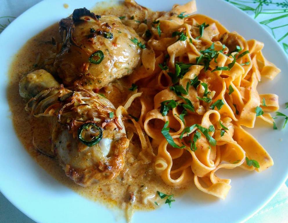 Statt Chilinudeln kann man auch andere Beilgen, wie z. B. Spätzle zum scharfen Zwiebelhuhn servieren.