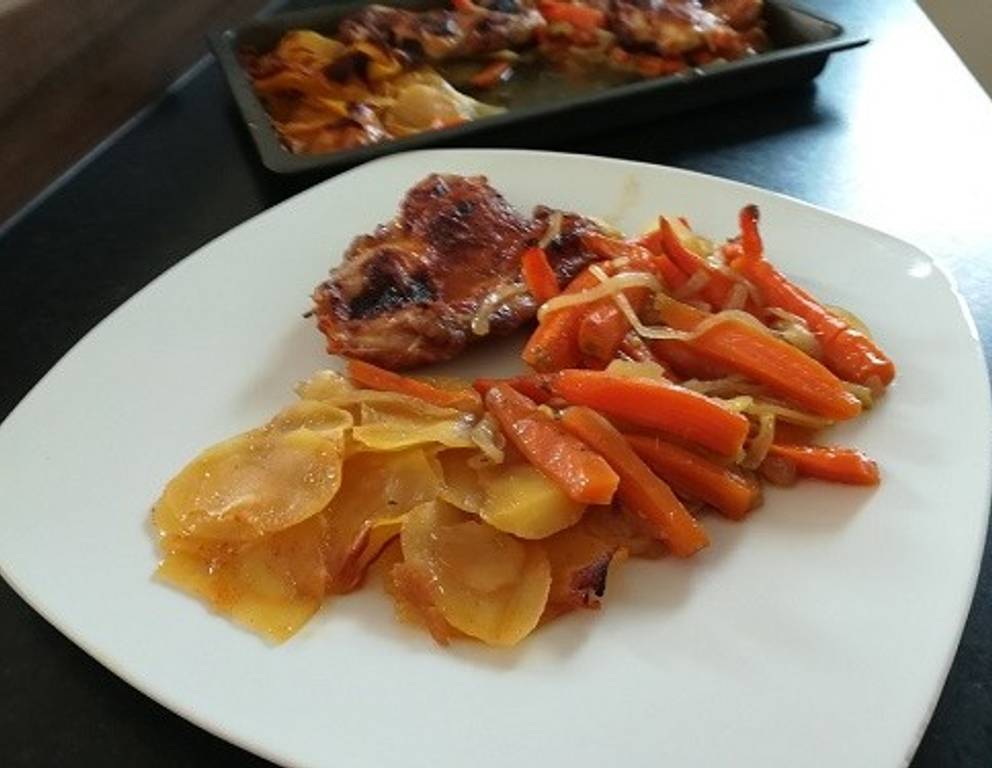 - Die Hühnerkeulen mit dem Ofengemüse anrichten und servieren.