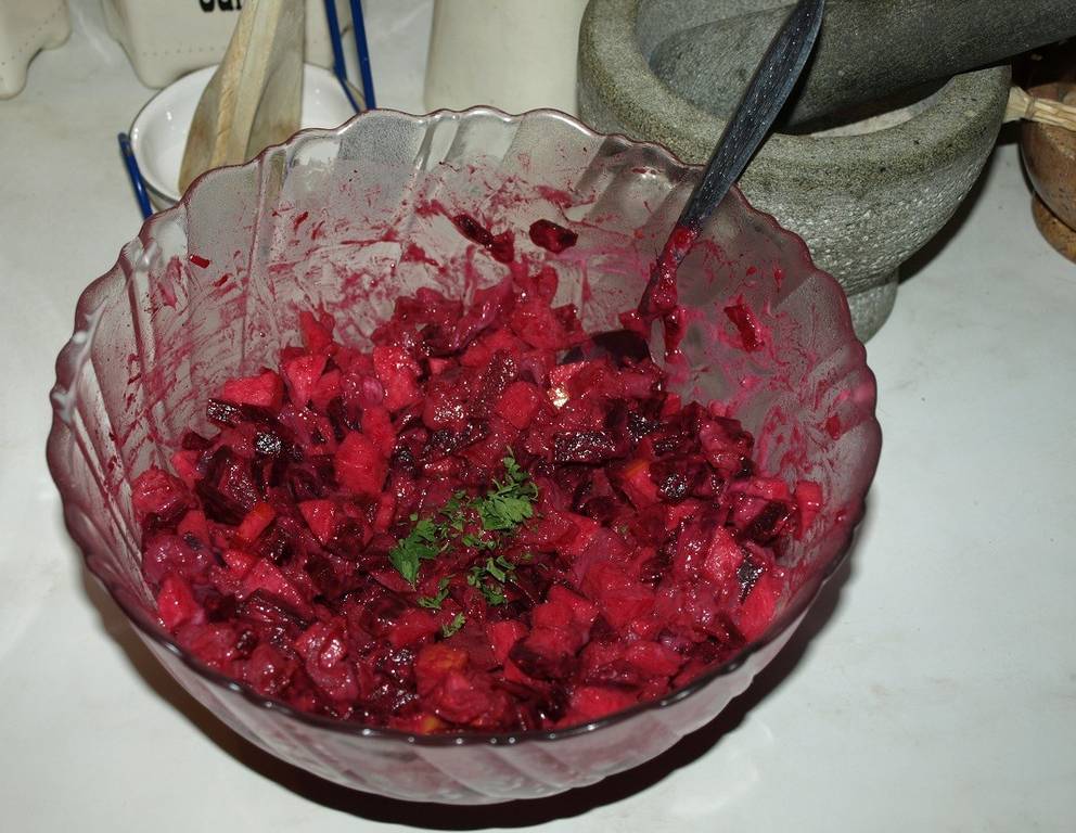 - Für den Heringsschmaus mit Roten Rüben zuerst die roten Rüben und die Erdäpfel weich kochen. Schälen und in kleine Stücke schneiden. Den Apfel, die Russen und etwas Kraut klein schneiden - untermischen.