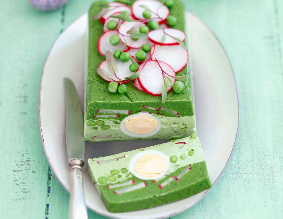 Vegetarier machen die Spinat-Erbsen-Terrine mit Eiern und Radieschen mit Agar Agar.