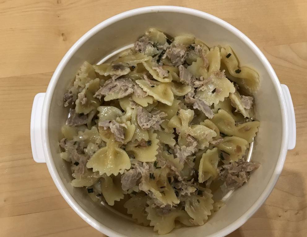 - Öl erhitzen und den Knoblauch darin scharf anrösten. Thunfisch zugeben und ca. 2 Minuten anbraten. Mit Zitronensaft und Schlagobers ablöschen.