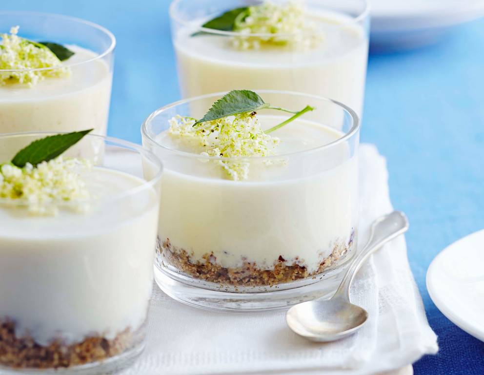 - Holunder-Cheesecakes zum Servieren mit Holunderblüten garnieren