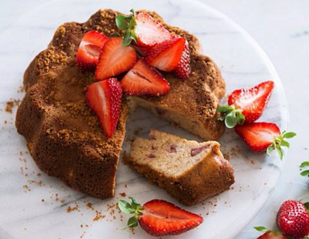 - Abkühlen lassen, vorsichtig aus der Form nehmen und auf einem Kuchengitter vollständig auskühlen lassen. Mit den restlichen Erdbeeren anrichten.