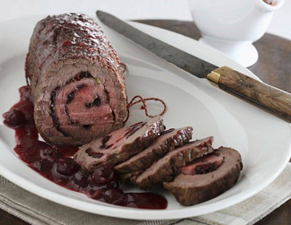 - Den Rollbraten mit Kirschfüllung auf einer Platte anrichten, vom Küchengarn befreien, in Scheiben schneiden und mit etwas Kirschsauce umgießen. Die übrige Sauce separat dazu reichen.