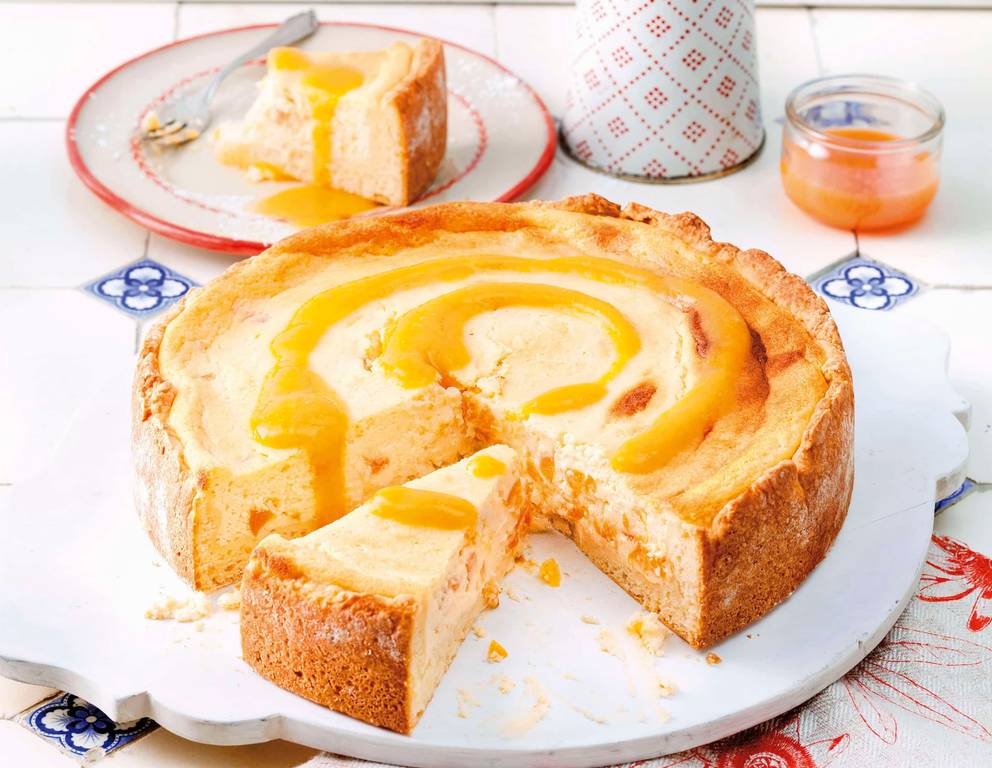 - Käsekuchen mit Marillenpüree aus der Form lösen und mit dem Marillenmark beträufelt servieren.