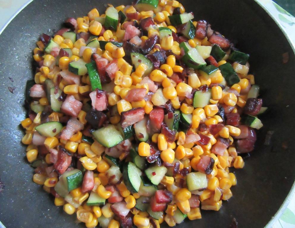 Sollte der verwendete Speck für Mais mit Zucchini und Speck recht mager sein, sodass sich nur wenig Eigenfett in der Pfanne bilden kann, vor dem Anrösten des Zwiebel 1-2 El Öl in die Pfanne geben.