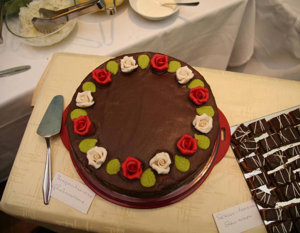 Burgenländische Grießkochtorte nach Geschmack mit Marzipanrosen dekorieren.