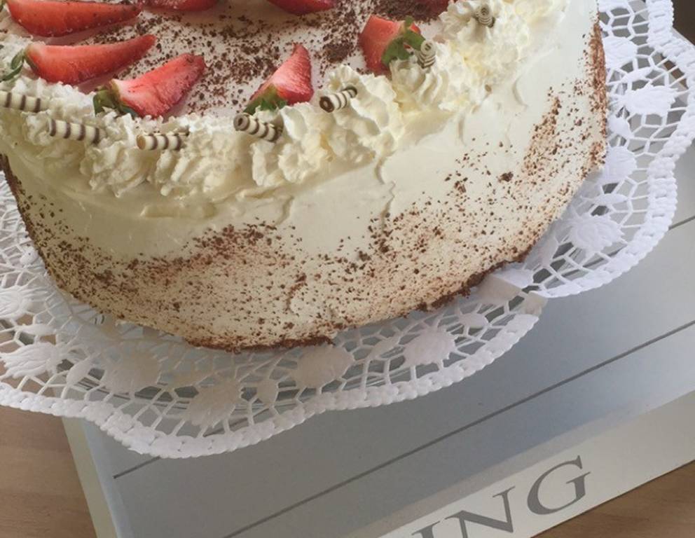 Erdbeercreme-Torte mit geschnitzten Erdbeeren dekorieren.