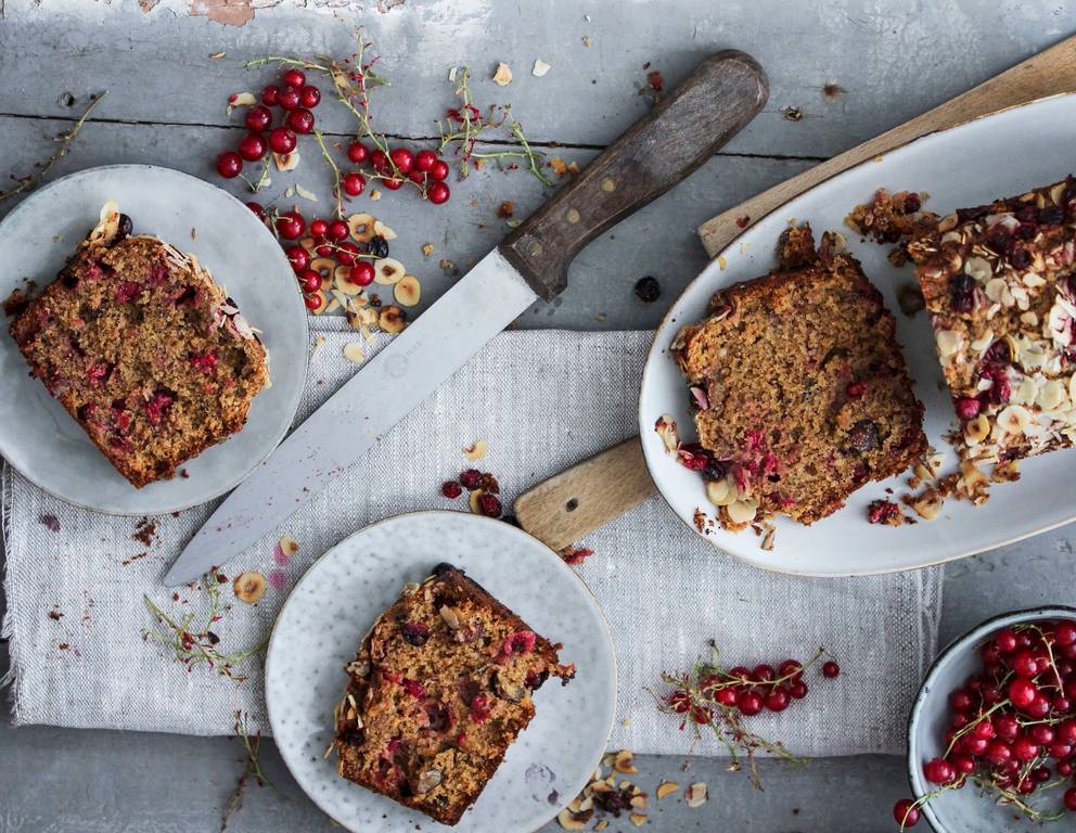 Brown-Butter-Ribisel-Kastenkuchen vor dem Servieren mit Staubzucker bestreuen.