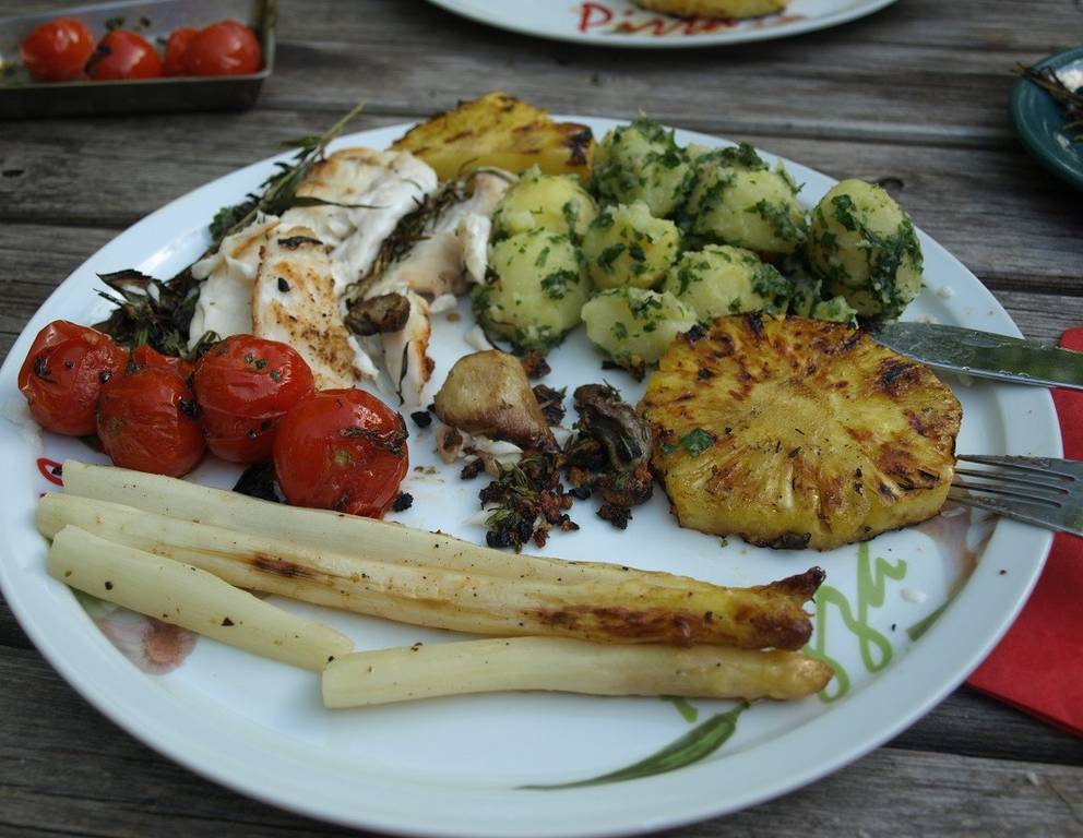 Zum gegrillten Amur passen Petersilkartoffeln, gegrillter Spargel, gegrillte Steinpilze, gegrillte Tomaten und gegrillte Ananas in Honig-Whiskymarinade.