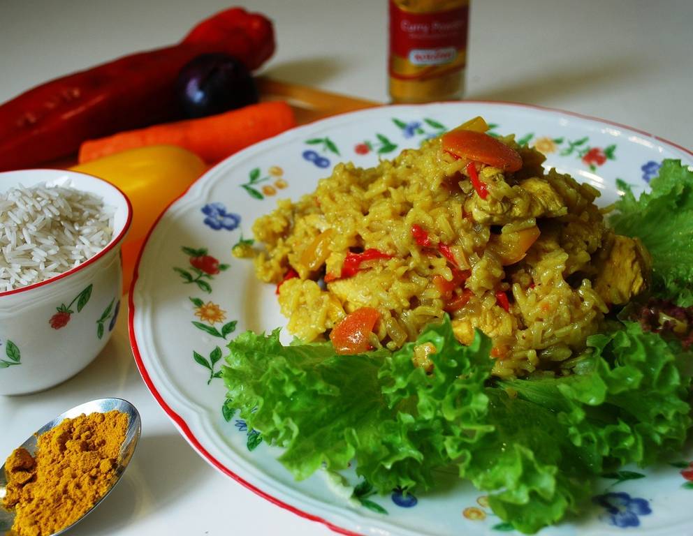 - Für das Reisfleisch mit Huhn zuerst alle Zutaten bereitstellen. In 2 EL Speiseöl die Zwiebeln und Karotten kurz andünsten, mit dem Currypulver stauben und gut verrühren.