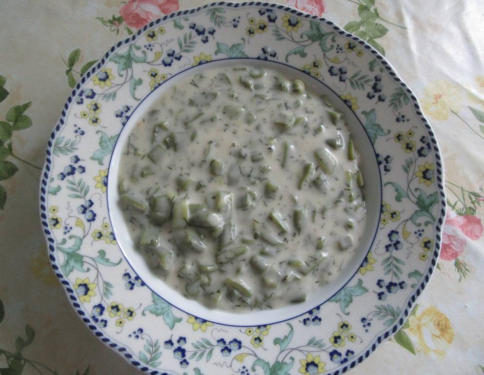 - Den Sauerrahm mit Mehl gut verrühren (damit keine Klumpen entstehen) und in die fertig gekochten Fisolen einrühren. Dille waschen, fein hacken oder schneiden und in die Fisolen einmengen.
