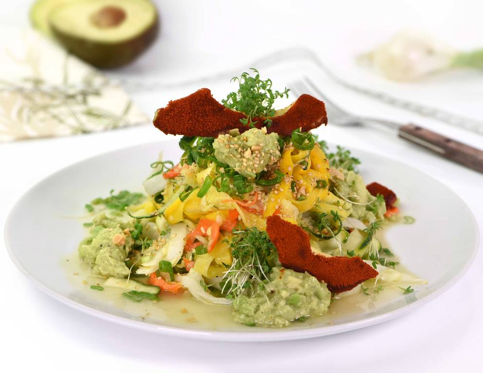 Der marinierte Zoodlesalat mit Avocado kann auch mit gerösteten Pinienkernen zubereitet werden.