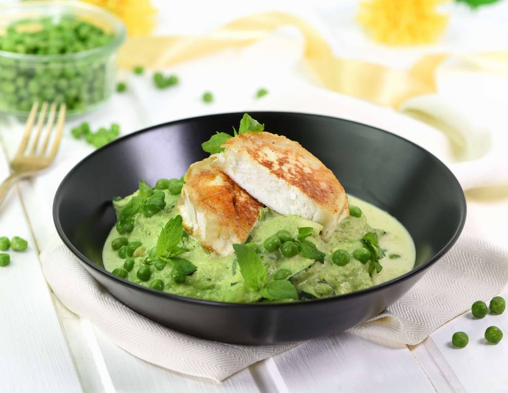 - Die Erbsen auftauen lassen, bzw. kurz in Salzwasser abkochen, sofern Sie frische, rohe Erbsen verwenden (TK-Erbsen sind in der Regel schon vorgegart). 1/4 der Erbsen separieren, den Rest zusammen mit den Zwiebelwürfeln in einem Topf mit Butter anschwitzen, sofort mit dem Obers ablöschen und mit dem Pürierstab fein pürieren. Dann mit Salz, Pfeffer und Muskatnuss abschmecken und die restlichen Erbsen hinzufügen.